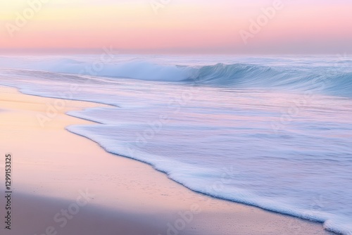 Pastel colors fill the sky over a peaceful beach at sunrise, with calm waves gently rolling onto the shore.