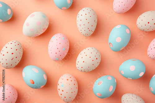Pastel Easter Eggs with Polka Dots and Stripes on Peach Background