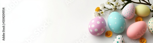 Pastel Easter Eggs with Spring Flowers on White Background