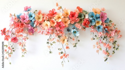 flower, floral, arrangement, coral, peach, pink, blue, white, background, wall, hanging, decor, decoration, wedding, event, spring, summer, pastel, colourful, vibrant, bloom, blossom, botanical, nature, beauty, pretty, elegant, romantic, feminine, delicate, soft, subtile, bright, cheerful, joyful, festive, celebration, artistic, creative, craft, hand-made, paper, design, flower, garland