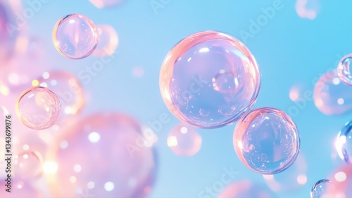 Pastel Pink and Blue Translucent Bubbles Floating on Light Blue Background
