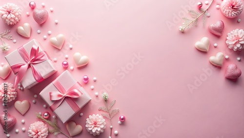 Pastel pink background adorned with gift boxes, hearts, and elegant decorations, creating a romantic and festive valentine's day flat lay composition with ample copy space.