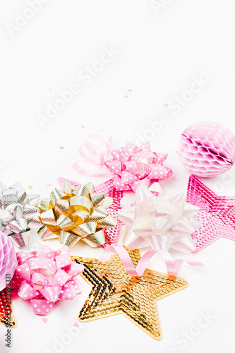 Pastel Pink confetti, unicorn toy and decorations. Flat lay, top view. Holiday composition for birthday party, New year/Christmas celebration or hen party concept theme. Flat lay, top view..