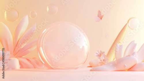 pink, pastel, bubble, flower, butterfly, background, display, product, beauty, cosmetic, soft, gentle, smooth, elegant, delicate, dreamy, serene, abstract, clean, bright, light, airy, summer, spring, romance, feminine, luxury, illustration, render, three-dimensional, design, studio, scene, template, texture, shape, vibrant, glow, shine, glossy, transparent