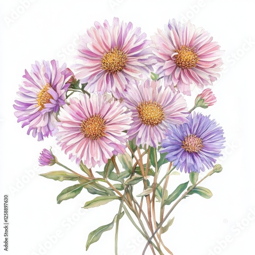 Pastel Purple And Pink Aster Bouquet Watercolor Illustration