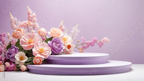 Pastel purple podium background and flower, Stand for product, Generative ai