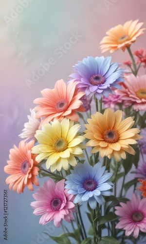 Pastel rainbow flowers in a soft gradient background, garden, floral, blue
