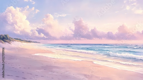 Pastel Seascape with Soft Clouds and Gentle Waves on a Sandy Beach