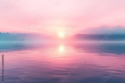 Pastel sunrise over a calm, glassy lake, with the soft, muted colors creating a serene and peaceful morning scene