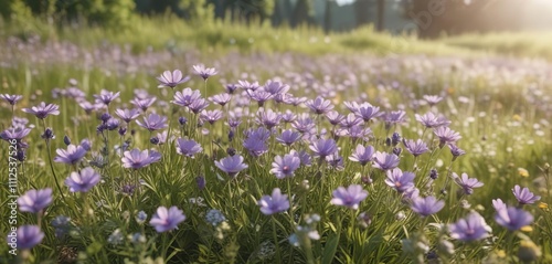 Pastel violet flowers bloom in a sunny meadow, meadow scenery, wildflowers