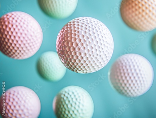 Pastel-Colored Golf Balls in Mid-Air Against an Aqua Blue Backdrop, Abstract Design