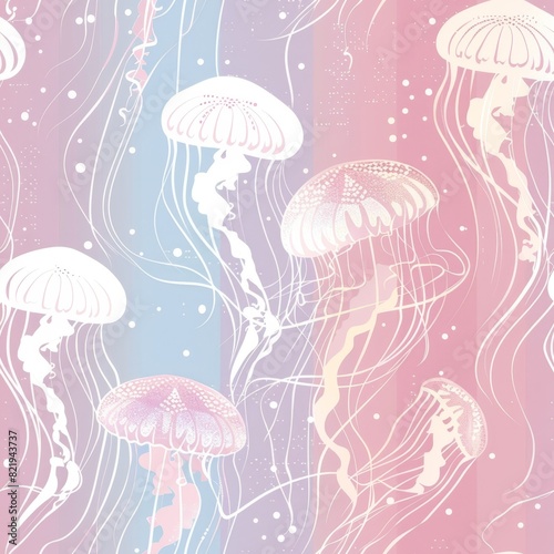 pastel, jellyfish, fantasy, underwater, illustration, marin, ocean, sea, creature, art, design, aquatic, life, nature, beautiful, artistic, background, soft, colours, swim, floating, tentacle, aethereal, tranquil, peaceful, delicate, marine life, fauna, elegance, graceful, pink, blue, white, transparent, drawn, whimsical, dreamy, magical, surreal, graphic, nautical, wildlife, mystical, oceanic