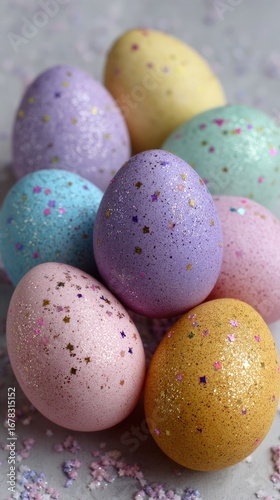 easter, egg, pastel, colourful, speckled, glistering, decorative, spring, festive, holiday, celebration, painted, hand-made, flocked, closeup, group, eggshell, light, bright, gold, pink, purple, blue, yellow, orange, sparkly, dot, speckle, shiny, pretty, celebratory, delicious, tradition, fun, gift