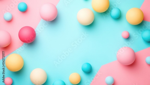 Pastel-colored spheres arranged on a teal and pink geometric background