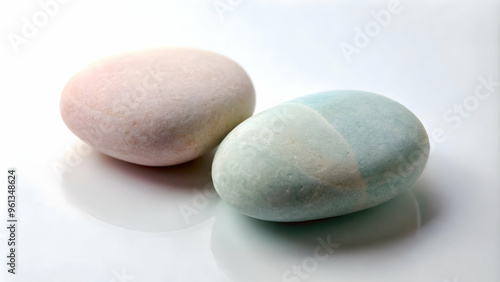 Pastel-Colored Stones: Two smooth, oval-shaped stones, one with a pink and white gradient and the other with a blue and white gradient, rest side by side on a white background. Their gentle pastel hue