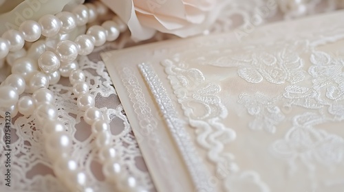 Pastel-Themed Wedding Cards on a Lace Background with Pearls
