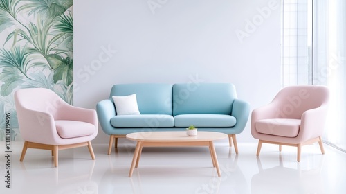 Pastel-toned living room set with a modern aesthetic. Soft furnishings in a calming color palette of light blue and blush pink.
