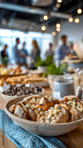pastry, snack, networking, food, gathering, wooden bowl, dessert, table, brown, event, office, meeting, colleague, blurred background, people, daylight, indoor, catering, refreshment, socialising, communication, conference, reception