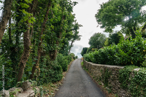 path along green trees and bushes on the left and stone wall on the other side into the horizon