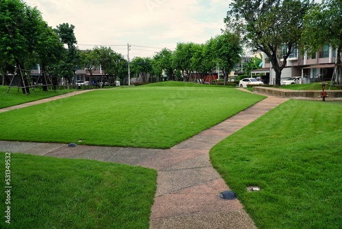 grass, park, nature, path, tree, landscape, golf, garden, lawn, tree, road, field, sky, summer, course, outdoors, sport, forest, meadow, blue, pathway, sand, winding