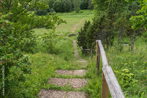 bush, flower, grass, green, herb, meadow, railing, slope, summer, tree