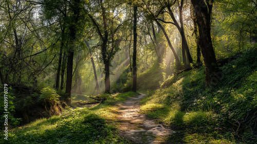 Path through spring forest with sunbeams breaking through leaves