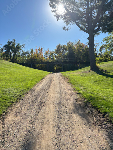 nature, golf course, path, tree, green, spring, field, lane, cloud, dirt, landscape, road