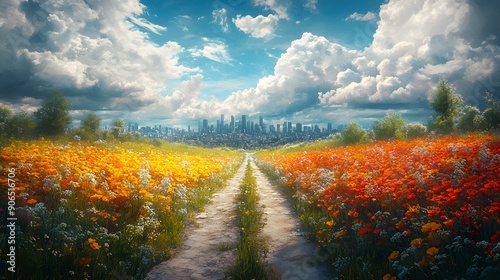 path, pathway, road, dirt road, field, flower, wildflower, meadow, orange flower, yellow flower, white flower, greengrass, blue skies, cloud, city, city landscape, building, skyscraper, horizon, nature, landscape, rural, spring, summer, travel, countryside, idylli, serene, peaceful, beautiful, scenic, colourful, vibrant, bright, light, sunshine, day, morning, afternoon, warm, romantic, dreamlike, fantasy, hope, inspiration, journey, destination