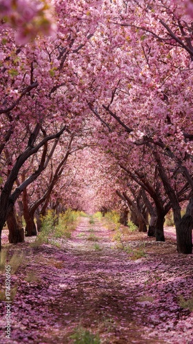 Pathway under vibrant pink cherry blossom trees. Petals cover the ground creating a tunnel