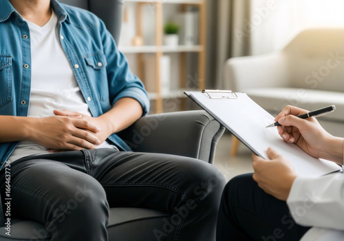 Patient discussing sexually transmitted disease symptoms with a healthcare professional, doctor takes notes during confidential medical consultation in a clinic.