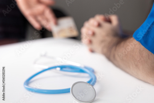 bribery, patient, doctor, corruption, medicals, system, stethoscope, pocket, money, table, assistant, banknote, health care, euro, office, payment, finance, scandal, illegal, transaction, medicine, consultation, cash, influence, fraud, deception, hidden, hospital, negotiation, ethic, moral, mask, surgical, face, giving, minimalist, blue, accept, thinking, confuse, portrait, blurred, private, favor, man, promise