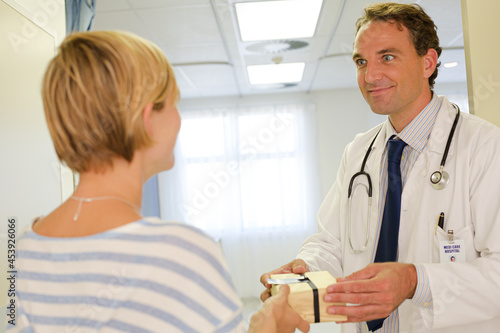 Patient giving doctor gift in hospital