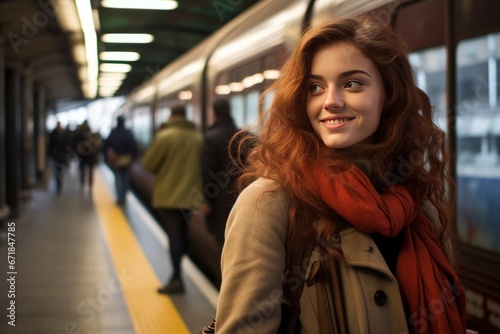 train, station, platform, woman, waiting, coat, foulard, blurred, people, subway, transportation, commute, public, city, urban, rail, track, passenger, yellow line, safety, travel, journey, transit, underground, subway, destination, arrival, departure, rush hour, tied-up, crowded, modern, infrastructure, public transport, smile, smiling, looking, lifestyle, hair