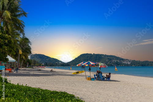 Patong Beach Phuket Thailand nice white sandy beach clear blue and turquoise waters and lovely blue skies with Palms tree sunset sunrise