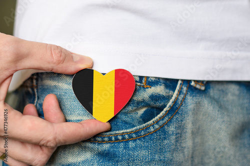 Patriot of the Belgium! Wooden badge with Belgium flag in the shape of a heart in a man's hand.