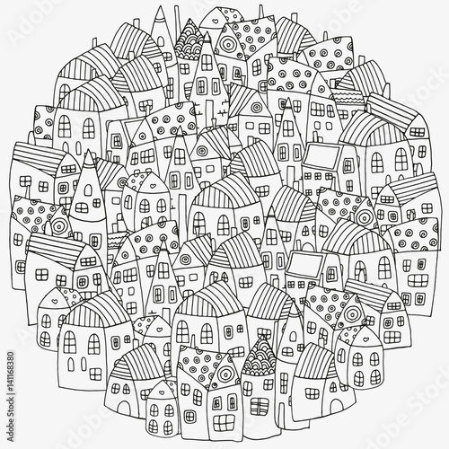 Pattern for coloring book with artistically houses. Street background. Ink pen. Zentangle. Black and white pattern in vector.