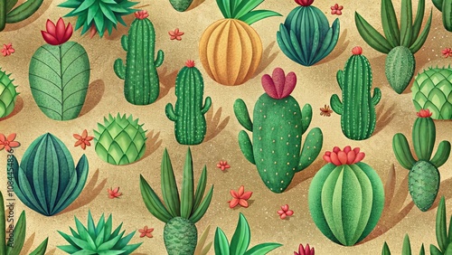 Pattern, illustration with cacti on a sand-colored background