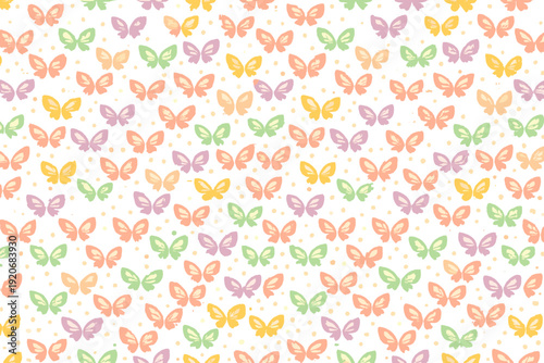 Pattern of colorful butterflies in soft pastel colors on a white background
