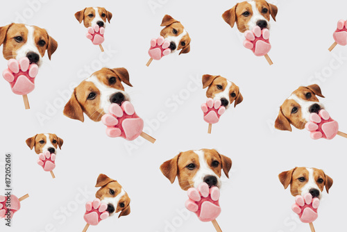 Pattern of the Jack Russell Terrier eats pink ice cream on a white background