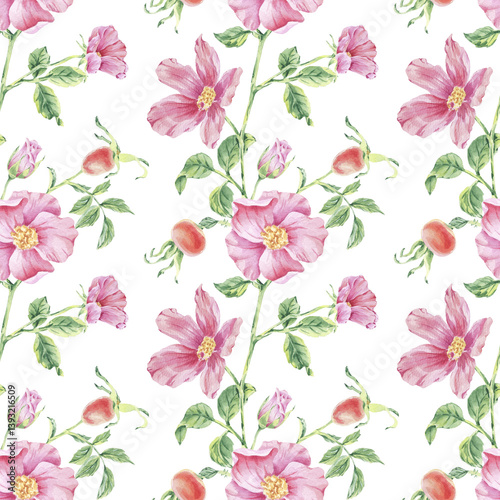 Pattern seamless pink wild rose on stem with foliage watercolor illustration on white. Rosehip flower print hand drawn botanical sketch for printing on wallpaper, textile, tableware, wrapping paper