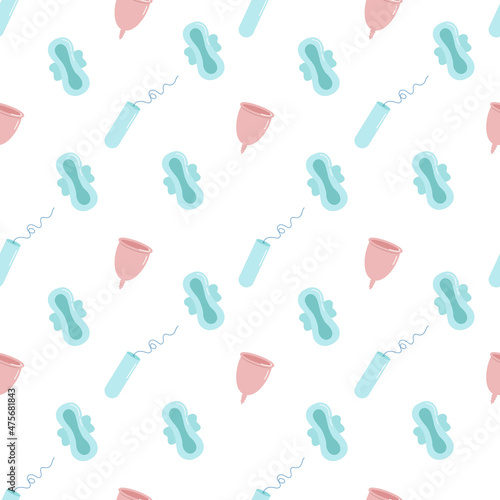 Pattern with pads, tampons and a menstrual cup. Pattern on the theme of the mentrual cycle. Vector illustration.