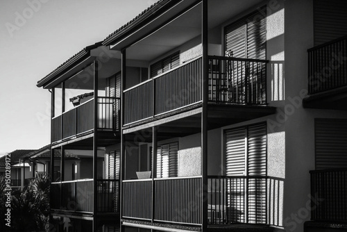 modern architecture, apartment building, city landscape, balcony, residential, contemporary, sunlit, shadow, pattern, design, structure, exterior, line, window, sunlight, contrast, aesthetic, natural light, architecture