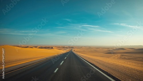 Paved highway stretching across a sandy desert beside the ocean under a clear sky