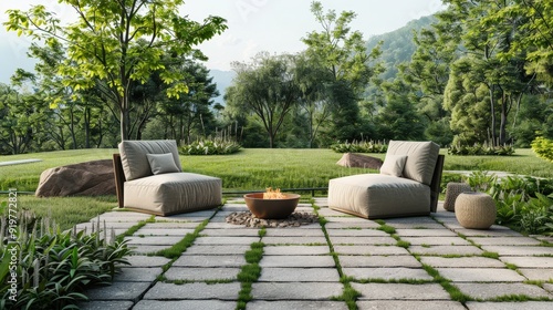 Pavers Paradise: Outdoor Comfort with Armchairs and Fire Pit in Lush Green Setting