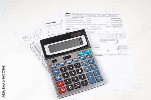 Paying taxes in USA. Calculator on financial documents. Tax return 1040. Tax calculation for USA citizens. Financial papers on white table. Submitting form 1040 to internal revenue service.