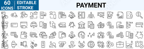 Payment. Linear icon set. Payment options. Outline payment method symbols. Money transfer. Banking, credit card, cash and transaction symbol. Vector illustration