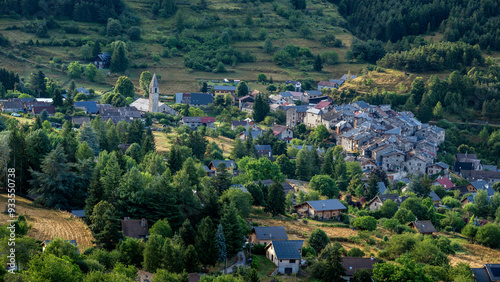 Paysage de montagne avec le village pittoresque de Saint-Dalmas-de-Valdeblore dans le massif du Mercantour en été en France