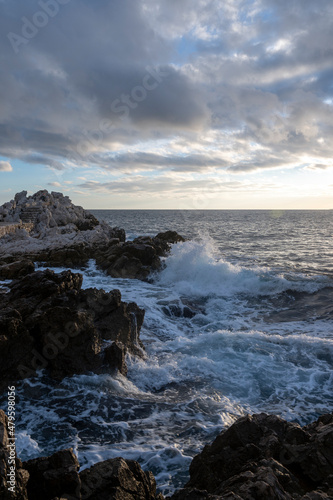 Paysage marin du rivage méditerranéen au Cap de Nice en hiver avec des vagues et des rochers au coucher du soleil