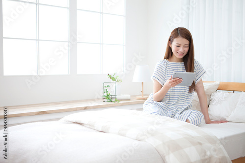 japanese, pajama, bed, bedchamber, young adult, lifestyle, relax, indoor, calm, relax, look, seated, 30s, possess, woman, smile, bedding, people, man, operation, adult, morning, ipad