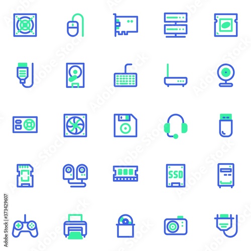 computer, hardware, component, icon, set, collection, pack, line, thin, outline, linear, vector, symbol, signs, web, illustration, element, logotype, pictogram, pixel, honed, design, clip art, graphic, simple, blue, green, colours, central processing unit, processor, jampacked, cable, mouse, memory, network, electronic, server, router, fan, flash, hard, power, datum, drive, webcam, software, video, hard disk drive